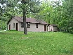 Eighteen structures in the Beach and Day Use Historic District are contributing structures and are protected as historic places.[5] These structures include seven "standard" pavilions with pyramidal roofs and timber supports, a larger picnic shelter with a log railing and supports and a roof similar to those of the "standard" pavilions, and three water pump shelters. The water pump shelters were built of native stone and covered with pebbles, and have since been converted to picnic pavilions. The concession building, bathhouse, and museum are also protected. The concession building is a rectangular log building with saddle corners and a gabled roof with a cross gabled entryway.[5] The bathhouse is at the beach and was built with stone columns and a hip roof. The bathhouse walls consist of vertical wooden siding. The nature museum is a former stone and wood pavilion that is set into a dirt bank with stone walls. Four open pit latrines with wane edge siding and hipped roofs are also contributing structures to the Beach and Day Use Historic District. There are no non-contributing structures in the district.[5]
