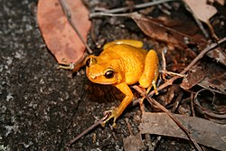 This large-eyed frog lays its eggs on land rather than in water. An adult tends to the eggs and young, which hatch as fully formed froglets. They have no tadpole stage.