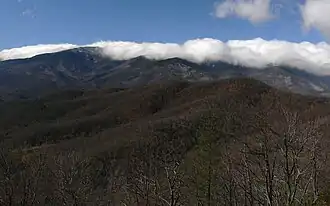 The forests of the Black Mountains are typically divided into three zones based on altitude: the spruce-fir forest, the northern hardwoods, and the Appalachian hardwoods. The southern Appalachian spruce-fir forest, though sometimes referred to as "boreal" or "Canadian," is a unique plant community endemic to a few high peaks of the Southern Appalachians. In fact, it is more akin to a high elevation cloud forest.[8] It is dominated by red spruce and Fraser fir, and coats the elevations above 5,500 feet (1,700 m). The northern hardwoods, which consist primarily of beech, yellow birch, and buckeye, thrive between 4,500 and 5,500 feet (1,400 and 1,700 m). The more diverse Appalachian hardwoods, which include yellow poplar and various species of hickory, oak, and maple, dominate the slopes and stream valleys below 3,000 feet (910 m). Pine forests, consisting chiefly of Table Mountain pine, pitch pine, and Virginia pine, are found on the drier south-facing slopes.[9] mountain paper birch, which is rare in North Carolina, grows sporadically on the slopes of Mount Mitchell.[10]