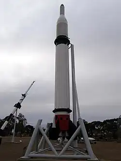 At the same time, Britain had also never previously developed a ballistic missile before, the field being relatively new and with few participants, thus there was significant value in developing and constructing a research ballistic missile in order to gain experience and data on how to design and build such vehicles, develop launch techniques, and general handling.[3] Accordingly, during 1955, the Black Knight research rocket programme was commenced for this purpose.[4][5] Following several launches, the Black Knight came to be regarded as a successful programme, having produced a relatively low cost and reliable rocket, and thus there was impetus present to proceed with further development of the platform.[6]
