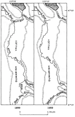 The Duwamish people lived along the Black River for many centuries. Duwamish settlements remained along the river until it dried up in 1916.[6] Several indigenous villages were located near the confluence of the Black and Duwamish rivers. The area was called "Inside Place" (Lushootseed: Dxwdəw, from which comes the word "Duwamish"), referring to its location inland from Puget Sound. Long used as a place of refuge, the area became home to hundreds of natives displaced by the growing city of Seattle. The Black River was also a big fishery for the Duwamish people, until the river dried up.[7][8][9]