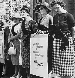 The Black Sash initially campaigned against the removal of Coloured or mixed race voters from the voters' roll in the Cape Province by the National Party government. As the apartheid system began to reach into every aspect of South African life, Black Sash members demonstrated against the Pass Laws and the introduction of other apartheid legislation. It would later open advice offices to provide information concerning their legal rights to non-white South Africans affected by that legislation.[4] These advice offices were a critical role of the organisation's brave and principled role as a vital component of civil society.[5]