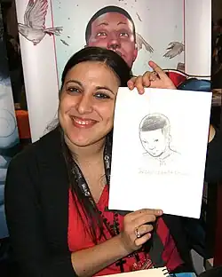 In creating the visual look for Miles, Pichelli followed her usual practice of approaching the design by giving thought to the character's personality, including the background that influenced it, and the distinctive traits that he would exhibit, such as the clothing he wears, his body language and expressions.[17] Pichelli also designed Spider-Man's new costume, a mostly black outfit with red webbing and a red spider logo. Pichelli had worked on four issues of Ultimate Spider-Man before she was approached to work on the new title with Miles Morales.[18] Pichelli, who works with a Cintiq 12wx graphic tablet,[16] added more screentones to her illustrations to give what she called "a more 'pop' feeling to the book", which she felt would be fitting to the series.[18]