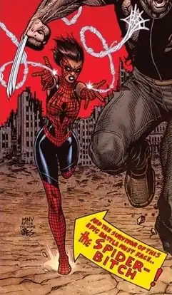 Spider-Bitch (Ashley Parker Barton) is a character appearing in American comic books published by Marvel Comics. Created by Mark Millar and Steve McNiven, the character first appeared in Wolverine #67 (September 2008). She is the estranged daughter of Peter Parker / Spider-Man's youngest daughter Tonya and Clint Barton / Hawkeye, and the stepdaughter of Tonya's husband Ultron 8, from the alternate-future of Earth-807128/21923, in which the supervillains overthrew the superheroes three decades earlier.[1] Having no superpowers, after being saved from execution by her estranged father and Old Man Logan in 2008's Old Man Logan storyline, Spider-Bitch kills the current Kingpin of Crime, succeeding him as the Kingpin of the Wastelands, revealing her true villainous nature, before unsuccessfully attempting to kill her father and Logan.[2]