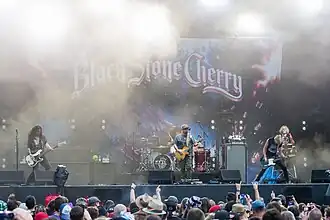 Black Stone Cherry is an American hard rock band formed in Edmonton, Kentucky in 2001. They were signed to Roadrunner Records until 2015; the band is now signed to Mascot Label Group. The band consists of Chris Robertson (vocals, guitar), Ben Wells (guitar), Steve Jewell (bass) and John Fred Young (drums). Black Stone Cherry has released eight studio albums as well as two EPs and have charted seventeen singles on the US Mainstream Rock Tracks charts. Their latest album, Screamin' at the Sky, was released in 2023.