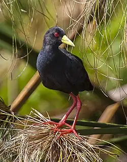 The black crake (Zapornia flavirostra) is a waterbird in the rail and crake family, Rallidae. It breeds in most of sub-Saharan Africa except in very arid areas. It undertakes some seasonal movements in those parts of its range which are subject to drought. No subspecies have been described. It appears that the oldest available name for this species is actually Rallus niger J. F. Gmelin, 1788, but Swainson believed that the earlier name was unidentifiable, and his own has since become well embedded in the literature.[2]