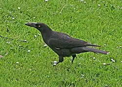 The black currawong (Strepera fuliginosa), also known locally as the black jay, is a large passerine bird endemic to Tasmania and the nearby islands within the Bass Strait.[2] One of three currawong species in the genus Strepera, it is closely related to the butcherbirds and Australian magpie within the family Artamidae. It is a large crow-like bird, around 50 cm (20 in) long on average, with yellow irises, a heavy bill, and black plumage with white wing patches. The male and female are similar in appearance. Three subspecies are recognised, one of which, Strepera fuliginosa colei of King Island, is vulnerable to extinction.