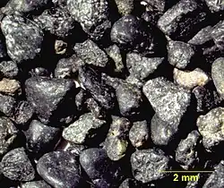 Black sand is sand that is black in color. One type of black sand is a heavy, glossy, partly magnetic mixture of usually fine sands containing minerals such as magnetite, found as part of a placer deposit. Another type of black sand, found on beaches near a volcano, consists of tiny fragments of basalt.