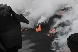 When lava contacts water, it cools rapidly and shatters into sand and fragmented debris of various size. Much of the debris is small enough to be considered sand. A large lava flow entering an ocean may produce enough basalt fragments to build a new black sand beach almost overnight. The famous "black sand" beaches of Hawaii, such as Punaluʻu Beach and Kehena Beach, were created virtually instantaneously by the violent interaction between hot lava and sea water.[2] Since a black sand beach is made by a lava flow in a one time event, they tend to be rather short lived since sands do not get replenished if currents or storms wash sand into deeper water. For this reason, the state of Hawaii has made it illegal to remove black sand from its beaches. Further, a black sand beach is vulnerable to being inundated by future lava flows, as was the case for Hawaiʻi's Kaimū, usually known simply as Black Sand Beach, and Kalapana beaches.[3] An even shorter-lived black sand beach was Kamoamoa.[4] Unlike with white and green sand beaches, walking barefoot on black sand can result in burns, as the black sand absorbs more solar radiation.[5]