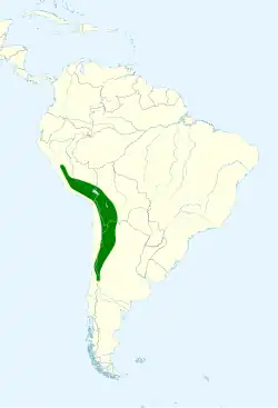 This is a bird of the high Andes Mountains in South America.[3] Its range extends from central Peru and northern Chile to western Argentina. Its height range is 3,500 to 4,500 metres (11,500 to 14,800 ft) but at the southern end of its range it occurs at slightly lower altitudes. Its typical habitat is rocky slopes and ravines, and the tussocky grassland with low shrubs that occurs in the Puna grassland ecoregion. It also occurs around habitations. It is often seen in pairs or in small flocks, sometimes with other species of finch, and generally forages on the ground or in low bushes.[3]