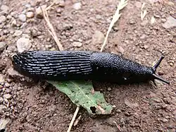 The black slug (also known as black arion, European black slug, or large black slug), Arion ater, is a large terrestrial gastropod mollusk in the family Arionidae, the round back slugs. Many land slugs lack external shells, having a vestigial shell.[2] Most slugs retain a remnant of their shell, which is usually internalized,[3] unlike other terrestrial mollusks (such as snails) which have external shells. Without such shells, slugs produce mucus—that may also contain toxins—to deter predators. Terrestrial slugs produce two other forms of mucus that facilitate locomotion and prevent death from drying. Such mollusks are hermaphroditic. Slugs most often function as decomposers but are also often omnivores. Arion ater is one such slug, decomposing organic matter, preying on other organisms, and consuming vegetative matter including agricultural crops.[4] Native to Europe, the black slug is an invasive species in Australia, Canada (British Columbia, Newfoundland, Quebec), and the United States (Pacific Northwest, Alaska).