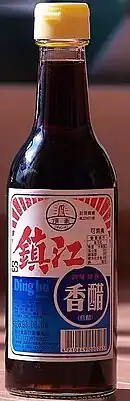 Another type of Chinese "black vinegar" is Zhenjiang vinegar (simplified Chinese: 镇江香醋; traditional Chinese: 鎭江香醋; pinyin: zhènjiāng xiāngcù) and similar condiments from southern China.[2] The condiment is an inky-black rice vinegar aged for a malty, woody, and smoky flavor.[3][4] It is made from rice (usually glutinous),[5] or sorghum, or in some combination of those, sometimes including wheat and millet.[6] Black vinegar was traditionally aged in clay pots.[7]