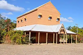 The ground floor walls rise to approximately 15 feet (4.6 m) and have an exposed frame 4-by-2-inch (102 by 51 mm) stud wall at 18-inch (460 mm) centres. Above this and the verandah the upper level is clad in horizontal mini profile corrugated galvanised iron and above this the gables have rusticated boards. Three double hung windows are located in west and north elevations and there are four windows in the south elevation. Each of these have quadrant form hoods in galvanised iron. The roof and verandah are clad in corrugated galvanised iron. A narrow timber stair runs from the upper level across the back of the building.[1]