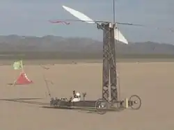 On 24 March 2010, the team ran the vehicle on the Ivanpah dry lake bed south of Las Vegas, Nevada, showing that it could accelerate dead downwind from a standstill and reach velocities well in excess of wind speed.[3][15][16] That is, the vehicle was progressing dead downwind faster than the wind. Officials of the North American Land Sailing Association (NALSA) were in attendance and one NALSA Board of Directors member (Bob Dill) was there for every run and collected his own rough wind and GPS data.[17]