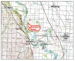Blackbird Bend is the name for areas in western Iowa along the Missouri River in Monona County, Iowa that have been claimed by the Omaha tribe of Nebraska and Iowa near Onawa, Iowa. The area is named for Chief Blackbird, an Omaha leader of the late 18th century. After lengthy court battles and several standoffs beginning in the 1960s, much of the area has been recognized as part Omaha tribal lands.[1] The Blackbird Bend Casino is located on this reclaimed territory.[2]