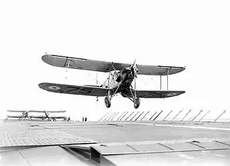 During 1929, the Ripon entered service with the Fleet Air Arm (FAA), six being operated by No 462 (Fleet Torpedo Bomber) Flight aboard HMS Furious in January of that year.[3] During early 1931, five aircraft were conveyed by the aircraft carrier HMS Eagle to Argentina for use as demonstration aircraft for the British Empire Exhibition in Buenos Aires held in March of that year. Numerous close formation flights were performed by the service's Ripons while off the coast of South America.[13]