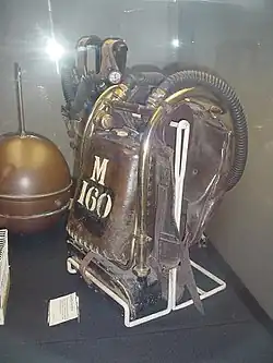 Its breathing bag was on the chest, of rubber, in a strong leather case. The other parts were in a backpack. It had two corrugated breathing tubes coming out of the backpack. Its duration on a fill was 2 hours. It had: