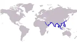 The blackfin scad is distributed throughout parts of the tropical and subtropical Indo-Pacific region. The species has been recorded as far west as the Persian Gulf (Kuwait)[6] and has a seemingly sparse distribution in the western Indian Ocean up to India and Sri Lanka. It is common around the Asian coast, Malaysia, Thailand, Philippines and as far south as Indonesia.[4] The northernmost captures have been made in Okinawa, Japan and a specimen has also been collected off Taiwan.[7] The species frequents inshore habitats, not found in the open ocean.[4]