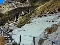 The location is based on unstable terrain owing to the underlying Gault Clay strata, resulting in a succession of huge landslips giving the area a very rugged appearance akin to the better known Jurassic Coast.[9] Currently the cliffs are eroding at a rate of about 3.5 metres per year, although this process is not gradual nor consistent.[10] Continuing landslides and coastal erosion swept away the paths in the early 1900s, and have since obliterated the chine itself and repeatedly forced the park owners to move the clifftop facilities inland.[3]