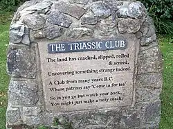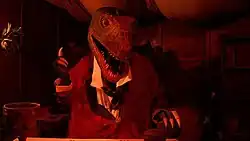 Featuring wallace the butler and darwin the allosaurus . Built on the site of the old swimming pool of the adjacent house five rocks ( rumpus mansion ) The Triassic Dinner Club was removed in 2016, but the dinosaurs have made two appearances at events since . This area now houses the mouth of hell . |