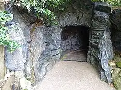 During Victorian times, people were seeking out new healthy holiday resorts, ideally near the coast. As the railway network was getting closer and closer to the south coast, the Isle of Wight was becoming an increasingly attractive holiday destination. Alexander Dabell, the founder of the park, soon realised the business potential of this, trying various ventures. In 1839 Alexander became friends with a publican who had recently built a hotel at Blackgang, which now forms the Chine Cafe (formerly Pirates' Pantry restaurant) and administration offices.[1] After studying the gault and chine gorge, he knew instantly that gardens could be set up that would appeal to the Victorians as a romantic holiday destination. This along with the increasing popularity of the adjacent Sandrock Spring (a chalybeate spring) led to Alexander concluding a lease for the site in 1842 and the establishment of Blackgang Chine amusement park in 1843. The area was then opened up to the public with pathways built down to the ravine and gardens landscaped on the cliffs. Steps were built to give access to the beach from the lower road. Since the park was opened, it has remained a family business, with the descendants of Alexander Dabell owning it ever since.[3][4] The park's claim to have been established in 1843 would make it the oldest theme park in the United Kingdom. Its initial theme of a general-purpose scenic and curiosity park led to one of its most famous attractions, a large whale skeleton, which had been washed up near the coast of The Needles in 1842, and is still a showpiece today.[1]