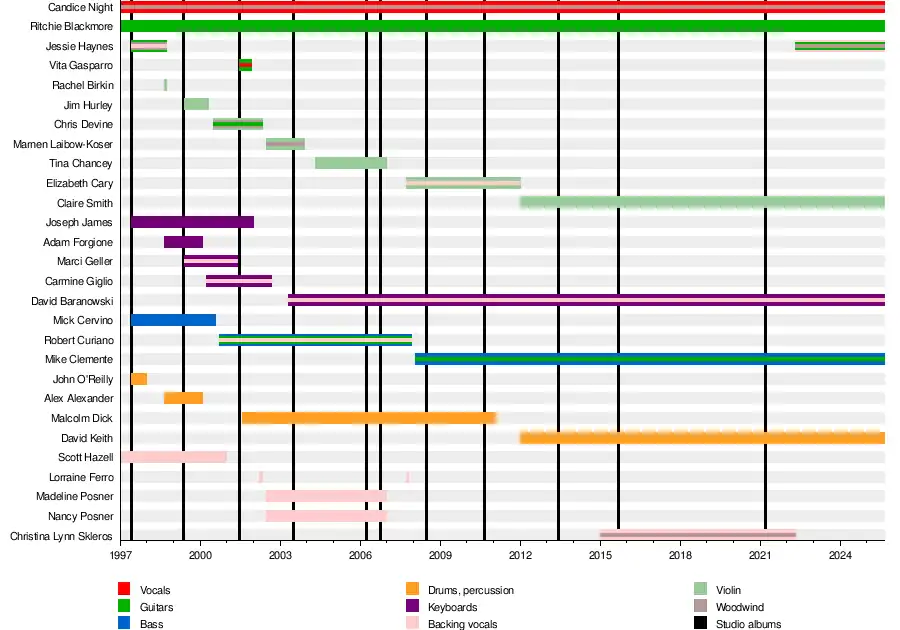 Blackmore's Night is a British-American neo-medieval folk rock band formed in 1997, consisting mainly of Ritchie Blackmore (acoustic guitar, hurdy gurdy, mandola, mandolin, nyckelharpa, and electric guitar) and Candice Night (lead vocals, lyricist, and woodwinds). Their lineup has seen many changes over the years; Blackmore and Night have been the only two constant members. They have released eleven studio albums. Their early releases were mostly acoustic and imitated early music, but eventually Blackmore's Night started using more electric guitars and other modern instruments, as well as performing folk-rearranged cover versions of pop and rock songs.