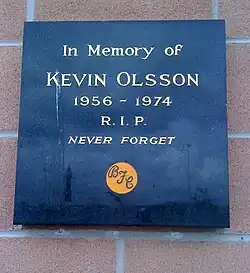 On 24 August 1974, seventeen-year-old Blackpool fan Kevin Olsson was stabbed to death at the back of the Spion Kop, Bloomfield Road at Blackpool's home match with Bolton Wanderers.[4][5]