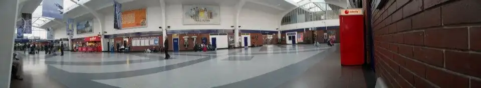 The station is staffed and open for 24 hours a day, and is equipped with payphones, vending machines, toilets and indoor seating,[11] as well as a customer service office and a booking office.[12] Step-free access to the station and platform is available for passengers with wheelchairs or prams, and portable ramps are also available for platform-to-train access.[11] The station has its own covered concourse and, adjoining the concourse, it has a Pumpkin cafe, as well as a Point shop to Go convenience store.[12] The station also has a 30-space car park,[11] and adjoining bus connections, which can also accommodate Plusbus ticket holders.[13]