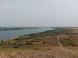The Blackstrap Coulee,[6] or Valley, is an ancient spillway created by the melting of the Wisconsin glacier. Two formerly small and marshy lakes, Theresa Lake and Blackstrap Lake, were in the area now covered by the reservoir. First Nations peoples used the valley for hunting and shelter. European settlers farmed the flat land of the valley during dry seasons. Some of this flat land forms the present lake bed and is an Important Bird Area (IBA) of Canada. The Blackstrap Coulee (SK 078) IBA covers an area of 77.18 km (47.96 mi) and includes Blackstrap Lake and neighbouring Indi Lake. Two hundred and thirty-nine different species of birds have been recorded at Blackstrap Coulee. Some of them include the western grebe, Franklin's gull, black tern, tundra swan, bufflehead, stilt sandpiper, red-necked phalarope, and the Forster's tern.[3][7]