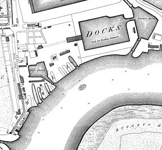 Blackwall Rock was located a short distance upriver of Blackwall Stairs, the southern end of a causeway from Poplar High Street which crossed extensive marshland, between the entrances of the West and East India Docks.[4] The rock was always a hazard to river traffic,[1] as it sometimes lay less than 3 feet (1 m) below the surface at low tide.[5] The entrance to the West India Docks, just to the south-west of the rock, was substantially obstructed by the reef upon the docks' opening in 1802.[6] In 1803, in his Strictures on the Alarming Progress of the Blackwall Rock in the River Thames, Robert Edington wrote that he surveyed the rock under the direction of the Corporation of the City of London's harbourmaster, Captain John Raymond Snow.[7] Prior to his survey, Edington was under the impression that the rock was 40 by 30 feet (12.2 m × 9.1 m);[8] Abraham Rees's Cyclopædia, published shortly before Edington's survey, had given these measurements.[9] Rees asserted that newspaper reports of one of Thomas Boddington's West Indiaman vessels being wrecked on the rock were incorrect, and that the relatively recent installation of piling and booms prevented ships from coming near the reef.[9]