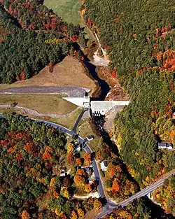 The earthen dam was constructed in 1941 by the United States Army Corps of Engineers with a height of 69 feet (21 m) and 1,150 feet (350 m) long at its crest.[1] It impounds the Blackwater River for flood control and storm water management as one of five related projects in the Merrimack River basin.[2] The dam is owned and operated by the New England District, North Atlantic Division, Army Corps of Engineers.
