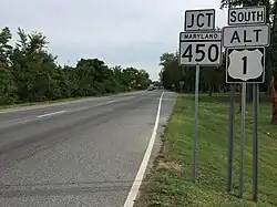 Several major surface roads serve Bladensburg. U.S. Route 1 Alternate is the only U.S. Highway serving the town. It follows Baltimore Avenue along a northeast-southwest alignment on the west edge of town. Major state routes serving Bladensburg include Maryland Route 201, which follows Kenilworth Avenue on a general north-south alignment, and Maryland Route 450, which follows Annapolis Road on an east-west route. Maryland Route 202 reaches its northern terminus at MD 450 in Bladensburg, while Maryland Route 769 follows the old alignment of MD 201 along minor surface roads through town. The nearest freeway is the Baltimore-Washington Parkway, which passes just east of the town limits.