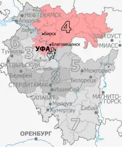 2016–present: Askinsky District, Baltachevsky District, Belokataysky District, Birsky District, Blagoveshchensky District, Burayevsky District, Duvansky District, Karaidelsky District, Kiginsky District, Kushnarenkovsky District, Mechetlinsky District, Mishkinsky District, Nurimanovsky District, Salavatsky District, Tatyshlinsky District, Ufa (Leninsky, Ordzhonikidzevsky), Ufimsky (Alexeyevka, Cherkassy, Dmitriyevka, Karmasan, Krasny Yar, Mikhaylovka, Milovka, Nikolayevka, Oktyabrsky)[6][7]