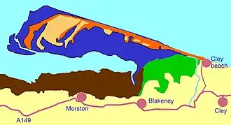 The Point was formed by longshore drift and this movement continues westward; the spit lengthened by 132.1 m (433 ft) between 1886 and 1925.[5] At the western end, the shingle curves south towards the mainland. This feature has developed several times over the years, giving the impression from the air of a series of hooks along the south side of the spit.[6] Salt marshes have formed between the shingle curves and in front of the coasts sheltered by the spit,[5] and sand dunes have accumulated at the Point's western end.[2] Some of the shorter side ridges meet the main ridge at a steep angle due to the southward movement of the latter.[7] There is an area of reclaimed farmland, known as Blakeney Freshes, to the west of Cley Beach Road.[8][9]