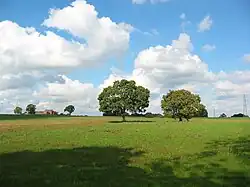 The civil parish has an area of 654 hectares (1,620 acres).[21] The area is rural and predominantly agricultural; farms include Half Moon Farm, Gonsley Green Farm, Lower Den Farm, Manor Farm, Doddington Mill Farm and Grange Farm. Forge Brook runs along the western boundary, Checkley Brook along the southern boundary and Mere Gutter and a tributary along or near part of the eastern boundary. Parts of these watercourses lie in steep-sided valleys. The terrain is undulating with low hills; the high point of 94 metres (308 ft) is in the south-east corner of the parish, and there is a trig point at 85 metres (279 ft) near Manor Farm, just to the north of Blakenhall village.[3][21][22]