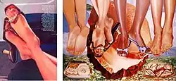 In 2000, Andrea Blanch, a veteran fashion photographer whose work had been published in many magazines and books of her own, was commissioned by Allure magazine to take pictures that would illustrate an article about glittery nail polish. While the magazine's creative director suggested the model to use, the brand of nail polish and the jewel-encrusted silk Gucci sandals she wore, Blanch chose the camera and film and lit the scene based on her years of experience. She came up with the idea to pose the model's feet, her legs crossed, on a man's legs in an airplane seat, to give it a slightly erotic sensibility. A picture of the model's feet in tight closeup was used in the magazine's July issue of that year; Blanch was paid US$750[28] ($1,400 in 2024[29]).