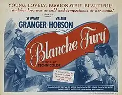 Blanche Fury is a 1948 British Technicolor drama film directed by Marc Allégret and starring Valerie Hobson, Stewart Granger and Michael Gough.[5] It was written by Audrey Erskine Lindop, Cecil McGivern and Hugh Mills adapted from the 1939 novel of the same title by Joseph Shearing. In Victorian era England, two schemers will stop at nothing to acquire the Fury estate, even murder. The plot is based on the Stanfield Hall slayings, an actual contemporary homicide case.