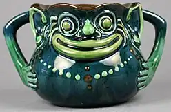 Vulliamy went on to work for several art pottery factories and was especially fond of portraying bats, goblins, and other reclusive and grotesque creatures, in a wide variety of materials, making wax and clay models to develop her pottery designs.[9][10] Her goblins were usually shown laughing or grinning,[8] and she herself referred to them as "bogies".[11]