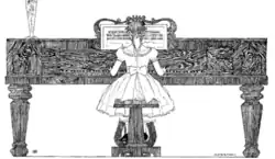 Ostertag was born in St. Louis and became a resident of Chicago. She was born to a German father Dr. Albert Ostertag from Württemberg and Swiss mother Annette Baudy.[6] In Paris, she exhibited at both Salons, where she may have been the youngest contributor, and also showed pictures at several American exhibitions before she found her true vein of decorative work. She produced covers, calendars, and posters, which were in demand among collectors. She also designed some elaborate chimney-pieces carried out in glass and gold mosaic. Her later work and first essay in book illustration was “Old Songs for Young America," done in collaboration with the musician, Clarence Forsythe. Her droll and dainty decorations in delicate colors were quite frankly inspired by Boutet de Monvel’s treatment of the nursery songs of France.[7]