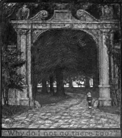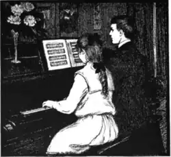On them followed other calendars, other title - pages, other covers, and posters. One advertising a piano course was a charcoal drawing of a demurely attentive boy and girl. Another for a linen sale set forth, in an admirable combination of a few colors, a mother in a white morning robe buttoning her little girl's starched frock beside an open bureau drawer wherein piles of embroidered garments could be seen. The two dainty figures were in themselves winning, but gathered artistic force from the child's carroty tresses against the pink-striped wall-paper, the flowered tester and hangings, the rich red brown of the old mahogany furniture. As usual in Ostertag's pictures, the furniture was of correct design. Another calendar that took like wildfire displayed in a harmony of greens and chromes a small Velasquez-like princess with spreading hoop and parrot on fist. Still another shows a pale boy dreaming by the side of a lily-covered pond while his mother reads a book; on one of the lily-pads a palpable fairyland creature has appeared, a fat frog wearing a golden crown. This is a symphony in sunny green and lemon yellow, with touches of faint lilac in the flowers and the mother's gown. The backgrounds were always architecturally sound. "Yankee Doodle" rides his pony through the quaintest of step-gabled streets and across a toll-bridge of the real old type. The pretty maid waits for Johnny to come home from the fair" in front of a genuine Colonial mansion, buff and white, with a fan-light over its columned portico.[1]