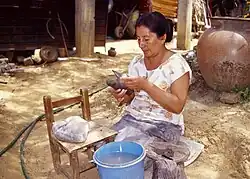 Her technique is also similar to her mothers, using simple tools including the bowl and plate “wheel” as well as clay mined locally.[6] Some of the basic shapes are created with molds but generally are modified by hand and the decorative details are also done by hand. She prefers to make pieces of natural clay color, so most of her pieces are not painted. However, sometimes she does cover them in a slip as a protective coating.[6]