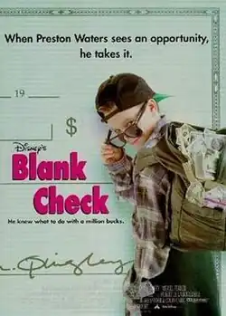 Blank Check (in the United Kingdom originally released as Blank Cheque)[3][4] is a 1994 American comedy film directed by Rupert Wainwright and starring Brian Bonsall, Karen Duffy, Miguel Ferrer, James Rebhorn, Tone Lōc, Jayne Atkinson and Michael Lerner. It was released on February 11, 1994, by Walt Disney Pictures. The film follows a boy who inherits a blank check and uses it to buy a house under an alter ego but is soon being searched for by several members of the bank he cashed it under.