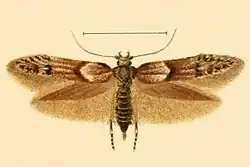 The wingspan is about 16 mm. The forewings have an ash-grey ground colour with reddish-brown markings. The hindwings are dark brown-grey.[2]