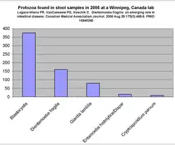 - A Canadian study of samples received in 2005 identified Blastocystis as the most prevalent protozoal infection identified.[91]