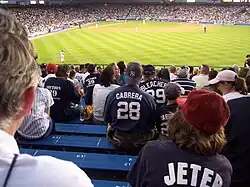 A prominent aspect of the Bleacher Creatures is their use of chants and songs.[3] The most distinguished of these is the "roll call", which is done at the beginning of every home game.[4] Often, the opposing team's right fielder, who stands right in front of the Creatures, is a victim of their jeers and insults.[5] For the last two decades of the original Yankee Stadium, the Creatures occupied sections 37 and 39 of the right field bleachers.[6] In 2009, when the Yankees' new stadium was built, they were relocated and currently sit in section 203 of the right-field bleachers.[7] Over the years, the Creatures have attracted controversy regarding their use of inappropriate chants along with their rowdiness.