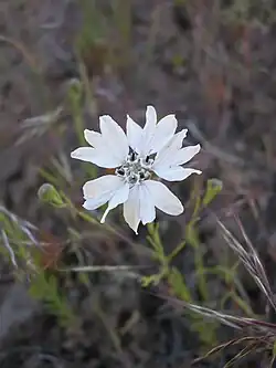 Growing up to several inches in height, the plant raises slender, fuzzy stems, with alternate leaves.[2] Atop the stems bloom between one and several daisylike flower heads.[2][4] These have 3โ8 three-lobed ray florets,[2] which are white with purple markings, while the center of the head is packed with about 10 white disc florets with purple anthers.[2] The fruit is a dark achene which often bears a pappus of a few stiff, light colored bristles, resembling human eyelashes (hence the common name of the plant).[4]