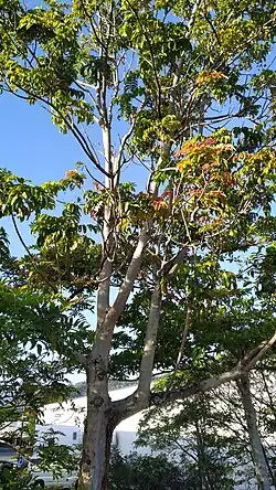 Blepharocarya involucrigera grows best in well developed rainforest, where it can reach 40 m (130 ft) in height with a dense rounded canopy, but in marginal habitats it may only reach 15 m (49 ft).[3][4] The leaves are compound with 10 to 18 opposite leaflets, up to 15 cm (5.9 in) long and up to 4.5 cm (1.8 in) wide, elliptic to ovate in shape. Mature leaves are dark green above and paler beneath, while new growth is a rosy red.[3][4][5][6] Above the basal pair of leaflets the rachis is flattened on the upper surface with angular edges (tending to winged).[3][4]