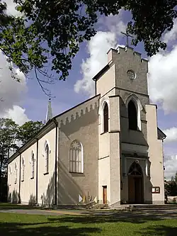 The first church was likely founded in 1445 by Mściwój Mszczuj. The current church was built between 1861 and 1866. It is a brick building with three naves, oriented with the presbytery facing east, and constructed on a rectangular plan. The roof is adorned with a small tower (a sygnaturka). At the front, there is a bell tower, which houses three bells: one likely from 1768, another from 1777, and a third with no casting date. Inside, there are altars from the 19th century, made by Jan Szczepański from Opoczno. In the side altar, there is a painting of Our Lady of Częstochowa, topped with an Ecce Homo depiction, dating from the late 18th century, as well as a sculpture of Saint Barbara from the first half of the 18th century. Under the stone floor, according to Father Wiśniewski, there is an entrance to a crypt.[1]