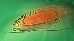 The rampart was built a considerable time later than the original timber palisade that defended the early settlement.[8] The rampart was originally 6.4 metres (21 ft) wide, with a 4 metres (13 ft) gap between the inner and outer retaining timber supports.[9] The rampart was built from chalk packed firmly between the timber retainers.[10] The second phase of the rampart was of the "Low Dump" type, with an asymmetrical cross-section and a shallow incline towards the rear, with a much steeper front dropping directly into the ditch.[11] This replaced the earlier filled-timber wall-and-fill style of rampart.[12] In the eastern part of the hillfort, the rampart has been badly damaged by ploughing, and in places destroyed. In the western portion, part of the rampart survives as a sunken lynchet, and the ditch there survives as a flat terrace.[2] In the first phase of the rampart, the ditch was approximately 1.5 metres (5 ft), but when it was recut for the second phase it was deepened to 4.6 metres (15 ft).[2] The hill features a number of unusual terraces or lynchets, the age and function of which is unknown, although they are believed to post-date the Iron Age.[2]