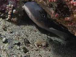 Contrary to its common name, the blind shark has "perfectly adequate" vision.[10] It was so named by anglers because it retracts its eyeballs and shuts its thick lower eyelids when removed from the water.[4] This species can live for up to 18 hours out of water, allowing it to survive being stranded by the outgoing tide.[9] The blind shark is secretive and sluggish during the day, with adults usually hiding in caves or under ledges and juveniles inside crevices, though it will take food given the opportunity. At night, it moves out over reefs and seagrass meadows to forage for small invertebrates (including crabs, shrimp, cephalopods, and sea anemones) and bony fishes. Prey items are captured via suction.[2][4]